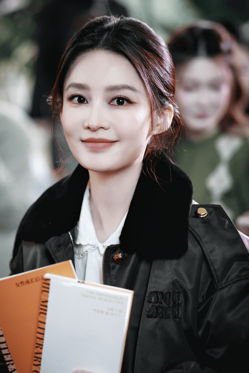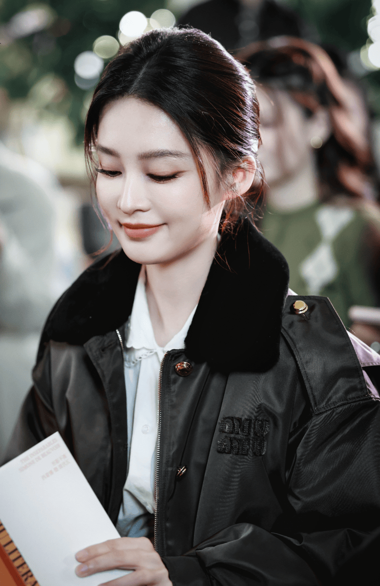 李沁的清冷气质成为造型的“粘合剂”。她的淡颜五官量感轻盈,流畅的下颌线与冷白皮自带疏离感,恰好中和了紫色丝袜的柔媚;而笑起来时的浅浅梨涡,又为工装夹克的酷感增添了温度。造型师巧妙地将她的长发低束成马尾,露出饱满的额头与精致锁骨,清透妆容仅以淡粉唇色提亮气色,让视觉焦点始终集中在服装的风格碰撞上,这种“减法搭配”反而让造型更具张力。