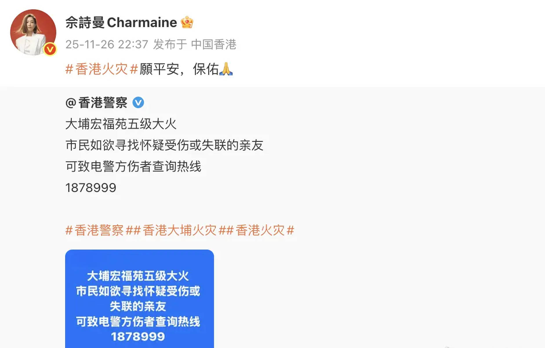 佘诗曼的行动则充满细腻的人文关怀。这位在香港观众陪伴下成长的艺人,直言“童年常去大埔市集,如今满目疮痍让人心痛”,真挚情感瞬间引发共鸣。她没有局限于文字祈福,而是接连转发警方寻人热线、义工招募信息,呼吁“哪怕只是转发一条救援信息,也可能帮到一个家庭”。当她写下“愿平安,愿顺遂”的落款时,传递的不仅是祝福,更是对家乡同胞的深切牵挂。