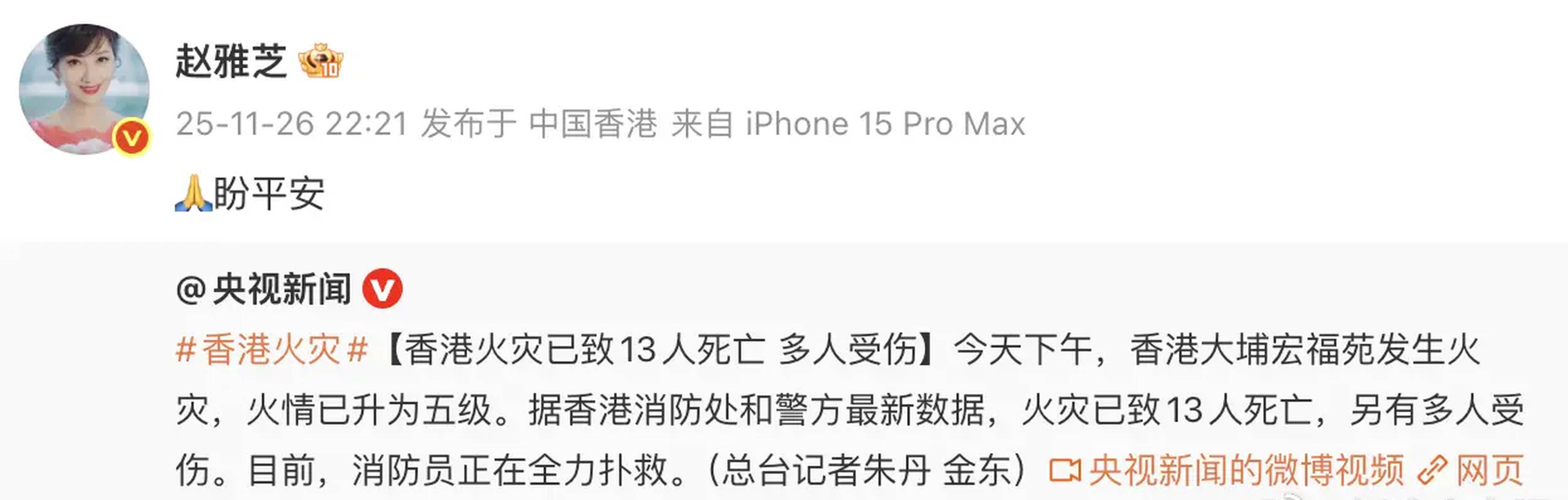 11月26日,香港大埔宏福苑突发的五级大火,如乌云般笼罩在同胞心头。这场被称为香港近三十年来最严重的火灾,已造成44人遇难、71人送医的惨痛后果,279人的失联名单更让无数人揪心。危难时刻,谢霆锋、佘诗曼、陈伟霆等艺人率先发声,用真挚祈愿与务实行动,掀起一场跨越地域的爱心接力。