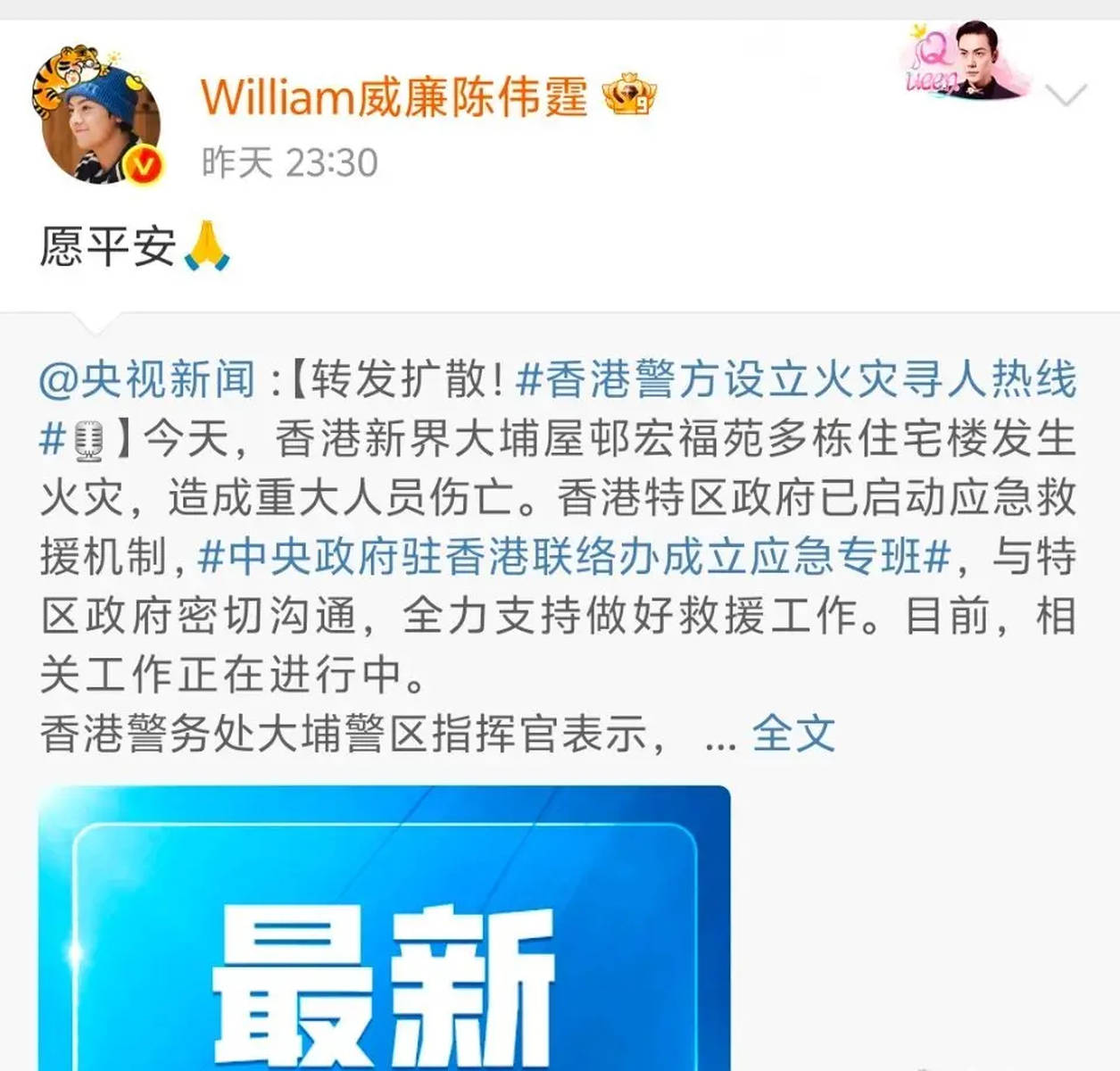 目前,大火虽未完全扑灭,但救援仍在继续,爱心仍在汇聚。谢霆锋们的祈福,佘诗曼们的牵挂,陈伟霆们的行动,早已超越娱乐圈的范畴,成为同胞同心的见证。灾难无情,但人间有爱,当无数微光汇聚,定能照亮重建家园的前路,让“愿平安”的祈愿,最终化为香港街头重现的烟火气。